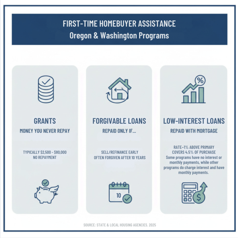 State and local programs in Oregon and Washington provide grants, forgivable loans, and low-interest mortgages to help first-time buyers. For example, Oregon’s OHCS Flex Lending can cover up to 100% of your down payment, while Washington’s House Key Opportunity and Home Advantage offer down payment assistance with no monthly payments. Understanding these options is the key to opening up your homeownership goals.